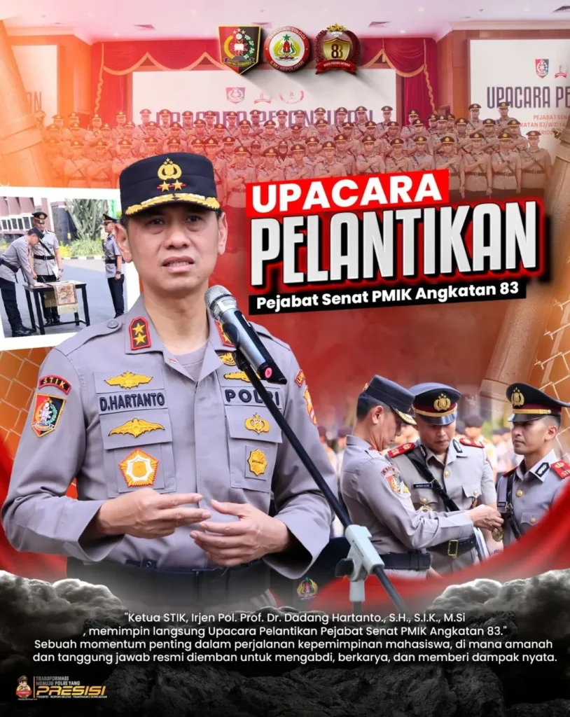 Pelantikan Pejabat Senat PMIK S-1 Angkatan ke-83 Widya Parama Satwika STIK Lemdiklat Polri. Kegiatan ini merupakan bagian penting dalam proses kaderisasi dan regenerasi kepemimpinan di Lingkungan Akademik STIK, yang bertujuan menumbuhkan karakter kepemimpinan mahasiswa yang bertanggung jawab, visioner, dan berintegritas, yang dipimpin langsung oleh Ketua STIK Lemdiklat Polri Irjen Pol. Prof. Dr. Dadang Hartanto, S.H., S.I.K., M.Si, Dalam sambutannya bahwa Senat PMIK memiliki peran Strategis sebagai Aspirasi Mahasiswa, mitra lembaga dalam pengembangan akademik serta motor penggerak budaya kampus yang sehat dan produktif.