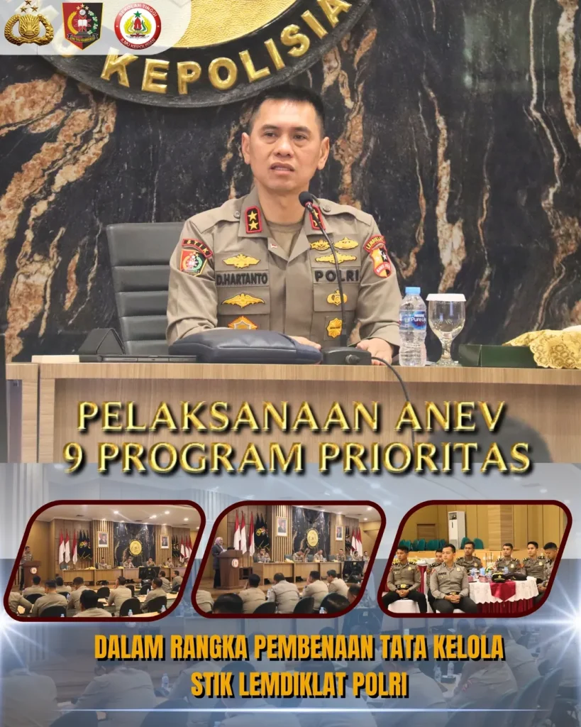 STIK Lemdiklat Polri melaksanakan kegiatan Analisis dan Evaluasi (Anev) 9 Program Prioritas sebagai Pembenahan Tata Kelola STIK Lemdiklat Polri secara menyeluruh. Kegiatan ini dipimpin langsung oleh Irjen Pol. Prof. Dr. Dadang Hartanto, S.H., S.I.K., M.Si., yang diikuti oleh Para Waket dan Dir STIK Lemdiklat Polri, Dosen Kepolisian Utama TK I STIK Lemdiklat Polri, Dosen Kepolisian Utama TK II STIK Lemdiklat Polri, Para Pejabat Utama, Dosen STIK Lemdiklat Polri dan Staf Personel Polri/ASN STIK Lemdiklat Polri.